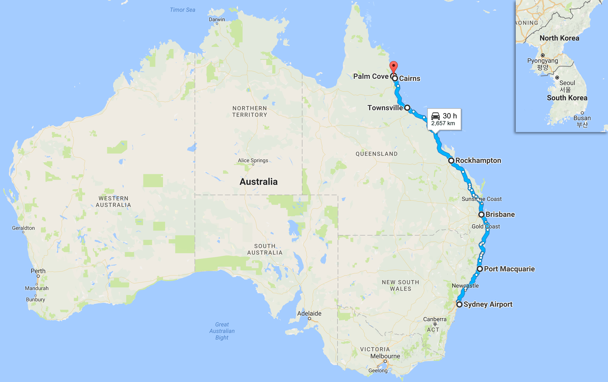 교통편을 알아보니 팜 코브는 인구 1,200명 정도의 조그마한 마을이라 공항이 없고, 그 근처 도시 케언스는 인천공항에서 바로 갈 수 있는 직항 항공편이 없었다.2 시드니같은 대도시만 직항 노선이 있었는데, 그렇게 되면 일단 인천공항에서 시드니로 이동한 후 다시 국내선을 타고 케언스까지 이동해야 했었다. 시드니에서 케언스까지 비행기로 세시간 정도면 가는 거리겠지만 자동차로는 주행시간만 최소 30시간 이상이 걸리는 거리였다. 그래서 앞뒤로 휴가를 조금 더 붙여서 자동차로 여행을 하는 방향으로 가닥을 잡았다.
